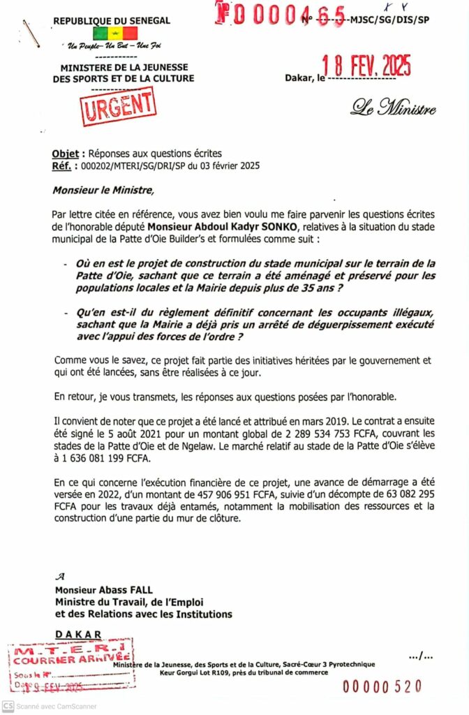 - Où en est le projet de construction du stade municipal sur le terrain de la Patte d’Oie, sachant que ce site a été aménagé et préservé par les populations locales et la Mairie depuis plus de 35 ans ?